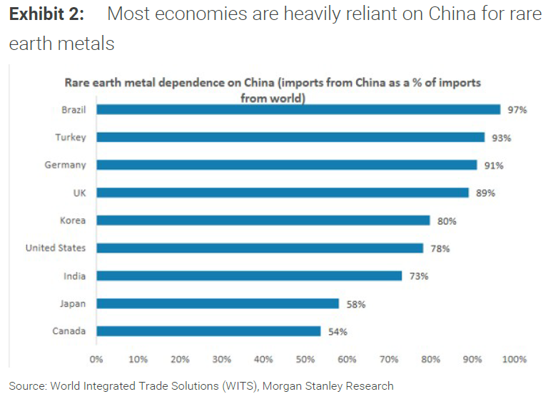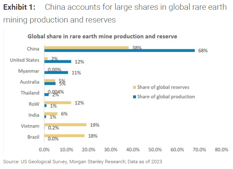 Sjældne jordarter, der er afgørende for mange voksende teknologier, er sandsynligvis  Kinas stærkeste kort . Men de har andre, som de også spiller på – såsom sojabønner. Og der er bekymring for, at de bluffer og bruger disse kort til at skjule betydelige svagheder,  der dukker op i deres vækstmodel. Arven fra Dengs langsigtede tænkning vises i disse to diagrammer fra Morgan Stanley. For det første har Kina en enorm andel af verdens reserver af sjældne jordarter og en endnu mere dominerende position i produktionen: