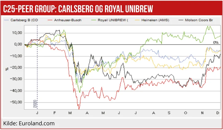 Carlsberg og især Royal Unibrew er over både det seneste år og målt over tre år løbet fra de vigtigste udenlandske konkurrenter. Selv om viruskrisen har ramt bryggeribranchen hårdt, kan Royal Unibrew nu – som den eneste blandt sine peers – opvise en højere aktiekurs end for et år siden. Kursmæssigt har Carlsberg også, ligesom ærkerivalen Heineken, klaret sig relativt godt gennem virusåret og ligger cirka 5 pct. lavere.