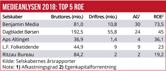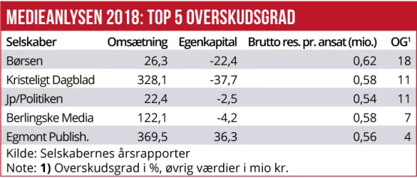 Af de selvstændige medier er Dagbladet Information og Sjællandske Medier mest udfordret. Ringere lønsomhed sidste år var der kun i North Media-datterselskabet Søndagsavisen A/S, hvor der også er en stor oprydning i gang, og i Aller Media, som er en del af Allers Etablissement.