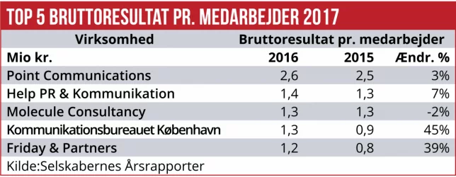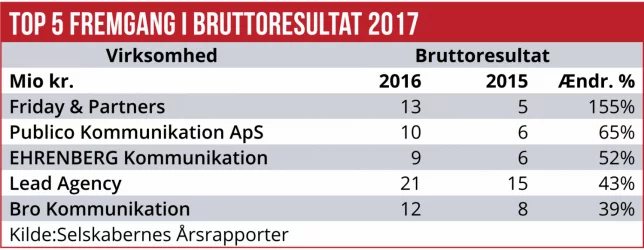 Bruttoresultatet blandt de 30 største danske kommunikationsrådgiver steg sidste år ti procent – til 457 mio. kr. Der var fremgang over en bred kam. Men nogle løb hurtigere end andre, blandt andet Friday & Partners, Bro Kommunikation og Publico Kommunikation.