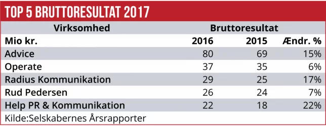 De fire største rådgivere, Advice, Operate, Radius og den nye nummer fire, Rud Petersen, fortsætter ufortrødent fremad. Mannov og Geelmuyden.Kiese står med store ufordringer, som det fremgår af artiklen næste side. I mellemgruppen har en stribe firmaer klaret sig rigtig godt, blandt andet Bro Kommunikation, der siden 2013 er vokset fra fem mio. kr. i bruttoresultat til 12 mio. kr. Her fra siger stifter og direktør Helle Bro, at væksten er skabt jævnt over de seneste år, med opgavetilgang fra både nuværende og nye kunder, som er kommet ind i butikken via anbefalinger fra andre kunder. Væksten er ikke genereret af fusioner og nye partnere, men af det samme hold, oplyser hun.