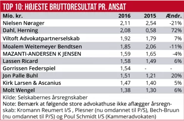 Blandt de store firmaer er det gennemsnitlige bruttoresultat pr. ansat jurist ca. 2,2 mio. kr., og det betyder, at de tre største advokatfirmaer, Poul Smith, Bech-Bruun og Kromann-Reumert sidste år hver især præsterede et bruttoresultat i omegnen af 600 mio. kr.