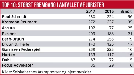 Mens de store advokatfirmaer tydeligvis har haft enorm medvind på motorvejen de seneste år, går det lagt mere trægt i de mindre advokatfirmaer. Økonomisk Ugebrevs årlige brancheanalyse af de 50 største advokatfirmaer viser, at de ti største advokatfirmaer har øget antallet af jurister med over 250 siden oktober sidste år.