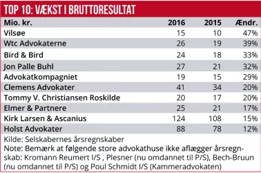 Blandt de allerstørste advokatfirmaer offentliggør kun Gorrissen Federspiel årsregnskab, og 2016 var første gang efter overgang til partnerskab (P/S). Selskabet oplyser ikke sammenlignelige 2015-tal, men angiver, at omsætningensteg 2 procent. I regnskabet hedder det, at ”I Gorrissen Federspiel kan vi se tilbage på et travlt 2016, hvor vi oplevede en øget efterspørgsel på kerneområ-der som børsret, corporate M&A, retssager, IT & datasikkerhed, shipping samt konkurrenceret – alle specialer, hvor vi med vores erfaring og brancheindsigt kan tilbyde dybde i rådgivningen. Gorrissen Federspiel kan for 2016 offentliggøre sit regnskab for første gang, idet 2016 var året, hvor vi ændrede selskabsform fra interessentskab til partnerselskab.”
