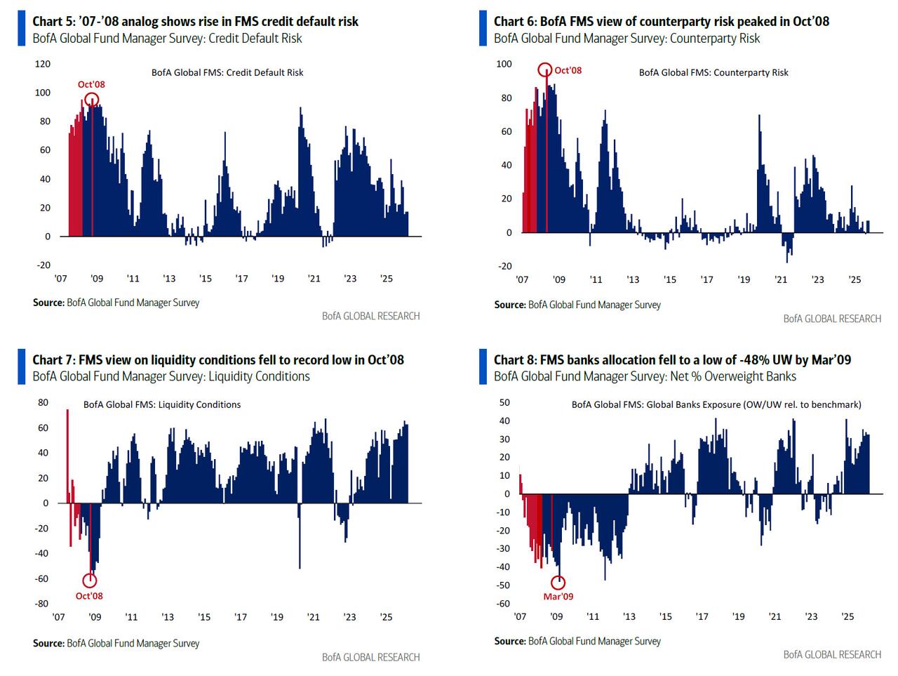 Well, just hours later, the comparison between 2026 and 2008 it appears is all most on Wall Street could talk about, thanks in no small part to the latest Flow Show note by BofA’s Michael Hartnett, who makes the analogy the key pillar of not only his “Biggest Picture” section, but the entire note, to wit: