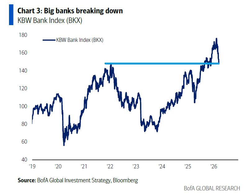 How is Hartnett trading this analog to 2008? As he explains in the Flow Show, he would fade oil >$100/bbl, US$ (DXY) >100, 30-year UST yield >5%, and SPX <6.6k. These are levels set to provoke war/oil/Fed/tariff policy response to short-circuit Main Street risks. Here, Hartnett reminds us of one of his favorite aphorisms (“market stop panicking when policymakers start panicking”), and writes that corrections end when “oversold” assets trough (software, bank loans & Bitcoin have, Mag7 & private credit have not), “overbought” are sold (gold, semis, metals, EM, Europe, banks getting hammered), and the “safe havens” lose bid (oil & US$). To be sure, this sequence is playing out which means liquidation pressures should soon ease if policymakers respond;