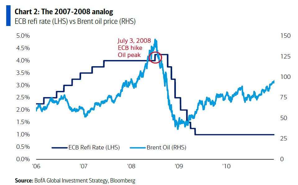 Michael Hartnett fra Bank of America bruger ifølge analysen parallellen til 2008 som hovedramme for sin aktuelle markedsvurdering. I perioden fra august 2007 til juli 2008 steg olieprisen fra cirka 70 til 140 dollar, mens de første rystelser i subprime-systemet allerede havde vist sig gennem BNP Paribas, Northern Rock og Bear Stearns. Den 3. juli 2008 toppede olieprisen samtidig med, at ECB hævede renten med 25 basispunkter, hvilket i eftertiden regnes som en alvorlig politisk fejltagelse. Kun 74 dage senere kollapsede Lehman Brothers, og finanskrisen eskalerede for alvor.