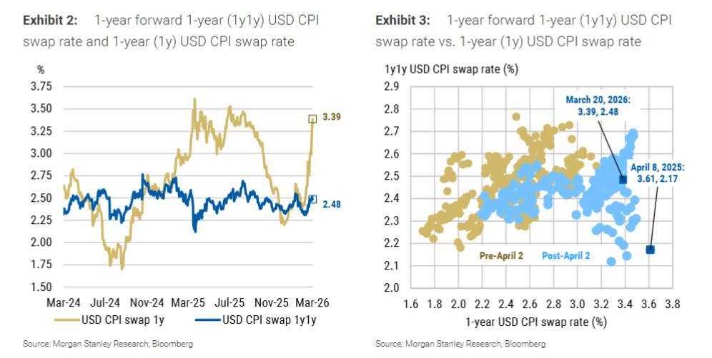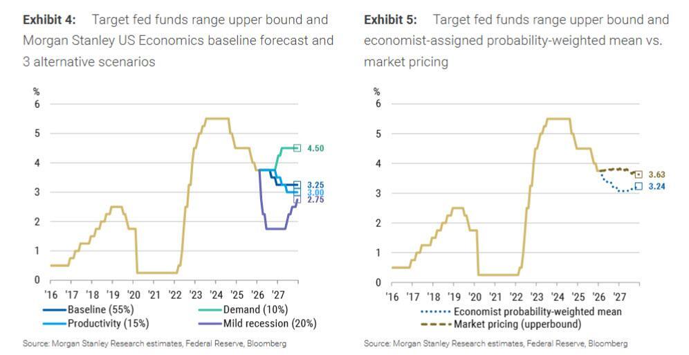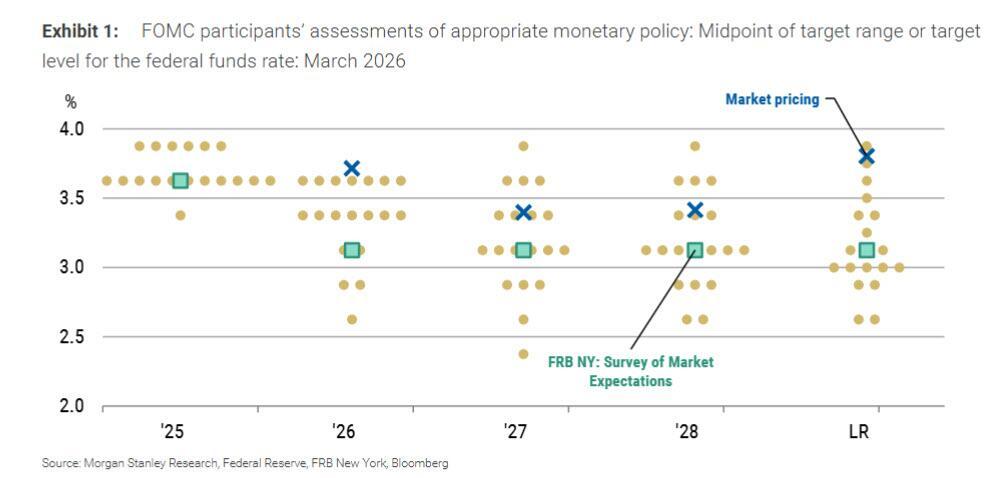 The MS rates guru writes that as the Iran conflict enters its second month, the US rates market finds itself in a recently unfamiliar position: pricing in a significant probability of a rate hike by year-end. At one point last week, the market priced over a 50% probability of a rate hike in December. Exhibit 1 shows the March 2026 dot-plot and prevailing market prices. All points on the market-implied path for Fed policy sit well above what primary dealers and market participants expect from the Fed – causing confusion amongst investors trying to