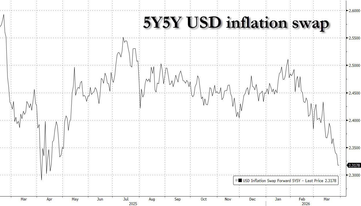 Yet despite the headlines, there’s been almost no increase in longer-term market inflation expectations. In fact, according to 5Y5Y inflation swaps – which help differentiate between short-term noise such as the current surge in energy prices, and entrenched inflation expectations – inflation over the next 5 Years is seen sliding by 20bps from the January highs and are now back to levels last seen during the April Liberation Day chaos.
