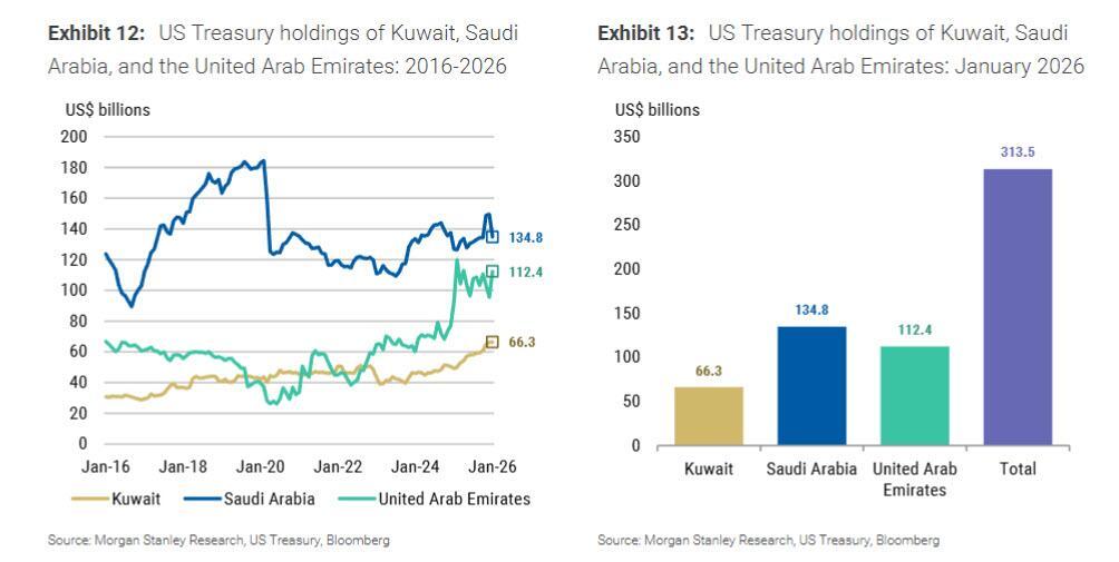 Til sidst rejser teksten endnu en risiko: at lande i Mellemøsten kan blive tvunget til at sælge amerikanske statsobligationer for at finansiere krig, forsvar og skader. Kuwait, Saudi-Arabien og De Forenede Arabiske Emirater nævnes som betydelige ejere af amerikansk gæld, og der henvises til data, som tyder på, at udenlandske monetære myndigheder allerede har reduceret deres beholdninger. Hvis sådanne salg tager fart, kan det lægge yderligere opadgående pres på de lange amerikanske renter, netop samtidig med at markedet forsøger at vurdere effekten af både vækstsvækkelse, mulig finanspolitisk stimulans og kommende centralbankreaktioner.