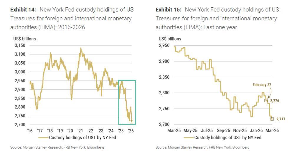Custody holding data from the New York Fed suggest foreign monetary authorities sold ~ $58bn worth of Treasuries since Wednesday, February 25 – resuming a decline in Treasuries held at the institution that began a year ago.
