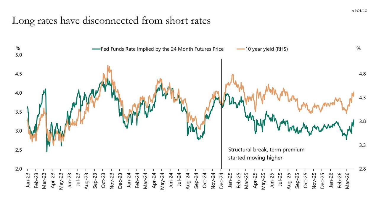 På rentemarkedet trækker teksten især på analyser fra Apollo og Morgan Stanley. Apollo-økonom Torsten Slok argumenterer for, at de amerikanske 10-årige renter ligger højere, end de “burde”, hvis man alene så på forventningerne til Federal Reserve. Ifølge ham skyldes den ekstra rentepræmie blandt andet bekymringer om amerikansk finanspolitik, mindre udenlandsk efterspørgsel efter statsobligationer, kvantitative stramninger og tvivl om centralbankens uafhængighed. Muligheden for, at Fed i fremtiden hæver sit inflationsmål, nævnes også som en risiko, fordi det kan gøre inflationen mere ustabil.