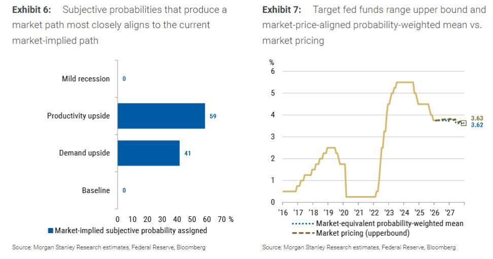 The charts above show that market prices look way out of line with the view of Morgan Stanley economists. When adjusting the subjective probabilities to produce a path that most closely aligns to the current market-implied path, there is a 41% probability on the “Demand upside”