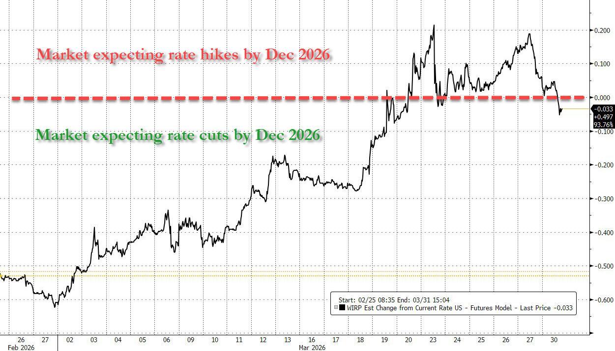 And indeed, after a week of pricing in rate hikes by Dec 2026, today something snapped and the market is back to pricing in modest rate cuts by the end of the year, ostensibly in response to what traders view as bigger damage to the economy, which will offset Fed fears about the inflationary spike, forcing the Warsh Fed to aggressively cut rates.