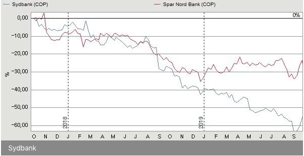 For det første har Spar Nords CEO Lasse Nyby de seneste år været en markant bedre bankdirektør end Sydbanks Karen Frøsig. Måske er det ikke helt rimeligt at sammenligne de to banker én til én. Men bundlinjen tæller: Spar Nord Bank fremstår i dag som langt mere veldrevet end Sydbank. Som et eksempel kan nævnes, at Sydbank-aktien de seneste to år er dykket 55 procent, mens Spar Nord Bank ”kun” er faldet 25 procent.