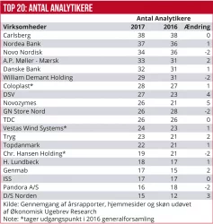 Som tidligere beskrevet i Økonomisk Ugebrev må prisen på aktieanalyser og adgangen til at tale med analytikerne ikke længere indgå i den samlede pris på handelskurtage, når man handler aktier gennem et finanshus. Der skal være et prisskilt på de enkelte dele. Og dermed tvinges kapitalforvaltere til at tage stilling til, hvem de vil bruge og betale for fremover. I det spil får danske analytikere det mere end svært, vurderer branchekilder over for Økonomisk Ugebrev. Ifølge Økonomisk Ugebrevs opgørelse fra juni følges 14 danske C20-selskaber af mere end 20 danske og udenlandske analytikere. Topscoreren er Carlsberg, der følges af 38 analytikere, med Nordea på andenpladsen med 37 analytikere og Novo Nordisk på tredjepladsen med 34 danske og udenlandske analytikere. Forventningen er, at ikke alle disse analytikere vil kunne overleve gennem brugerbetaling fra de professionelle investorer.