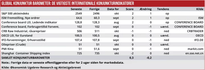 Økonomisk Ugebrevs KonjunkturBarometer for den Globale Økonomi viser i denne opdatering en samlet score på 0,3 efter et tilbagefald på 0,2 point – i det samlede udfaldsrum mellem plus to og minus to. Barometeret peger altså fortsat i retning af positiv global vækst, selvom vækstmomentum tydeligvis er aftagende.