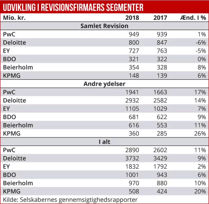 Bundlinjen er stadig, at PwC har landets største revisionsforretning, og forspringet til Deloitte er altså øget det seneste år. Placeringen er ikke gået PwC’s næse forbi, og den fremhæves også som noget af det første i årsrapporten: ”Vi har fortsat Danmarks største revisionsforretning.” Ingen af de store revisionsfirmaer er overdrevent gavmilde med segmentoplysninger for de enkelte forretningsområder, andet end at det går fantastisk eller rigtig godt.