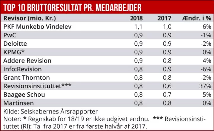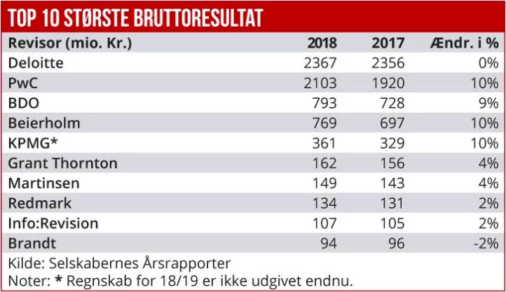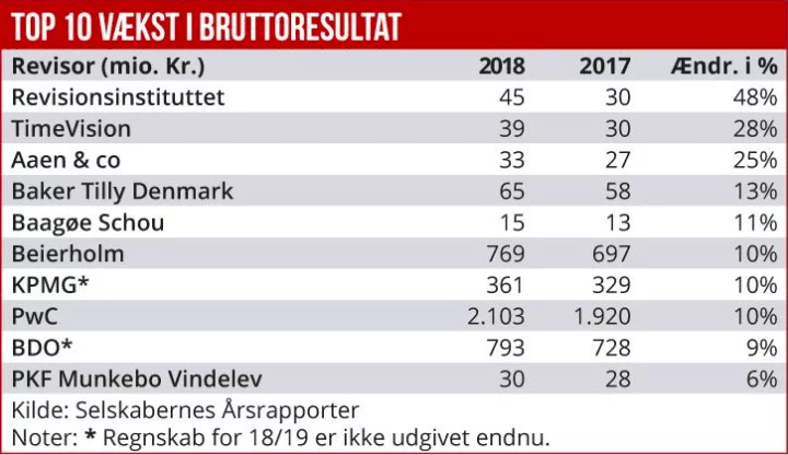 Målt på bruttoresultat fortsætter PwC med at hale ind på landets største revisionshus, Deloitte, og forskellen mellem de to bliver altså mindre og mindre. Bruttoresultatet hos PwC steg sidste år 10 procent til 2,1 mia. kr., mens det hos Deloitte lå fladt på knap 2,4 mia. kr. Formelt kan Deloitte dog godt sige, at væksten også her var 10 procent, men kun målt på omsætning, hvor hele væksten blev afleveret til andre eksterne parter.