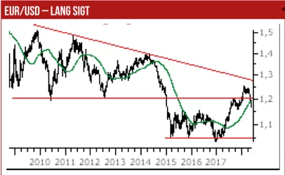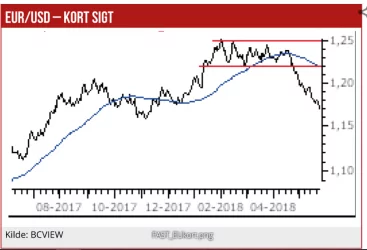 EUR/USD-forholdet fortsætter nedad, og nærmer sig nu bunden fra den 7. november 2017 i 1,159 EUR/USD. Fortsætter faldet ned under den grænse kan der blive tale om et meget dybt fald, som kan sende EUR/USD-forholdet ned mod støttelinjen ved 1,05 EUR/USD for fjerde gang siden begyndelsen af 2015.