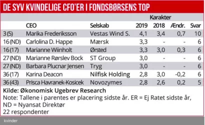 Det har også været synligt i Økonomisk Ugebrevs CFO-rating gennem flere år, hvor antallet af kvinder har været støt stigende. Efter lidt afgang og tilgang er der i år syv kvindelige CFO’er i de førende børsnoterede selskaber, hvilket er en mere end sidste år. De er stadig kun et mindretal blandt de i alt 42 ratede CFO’er, men det er et meget større mindretal end hos CEO’erne, hvor kun tre ud af 53 er kvinder.