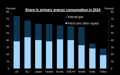 China the winner | The Chinese economy appears better positioned amid the oil supply shock than its global peers. One reason is that China’s energy and power reliance on oil and gas is much lower than its global peers. Crude oil and LNG accounting for 28% of China’s primary energy consumption in 2024, one of the lowest in the world. More on China as the relative |  EIA |