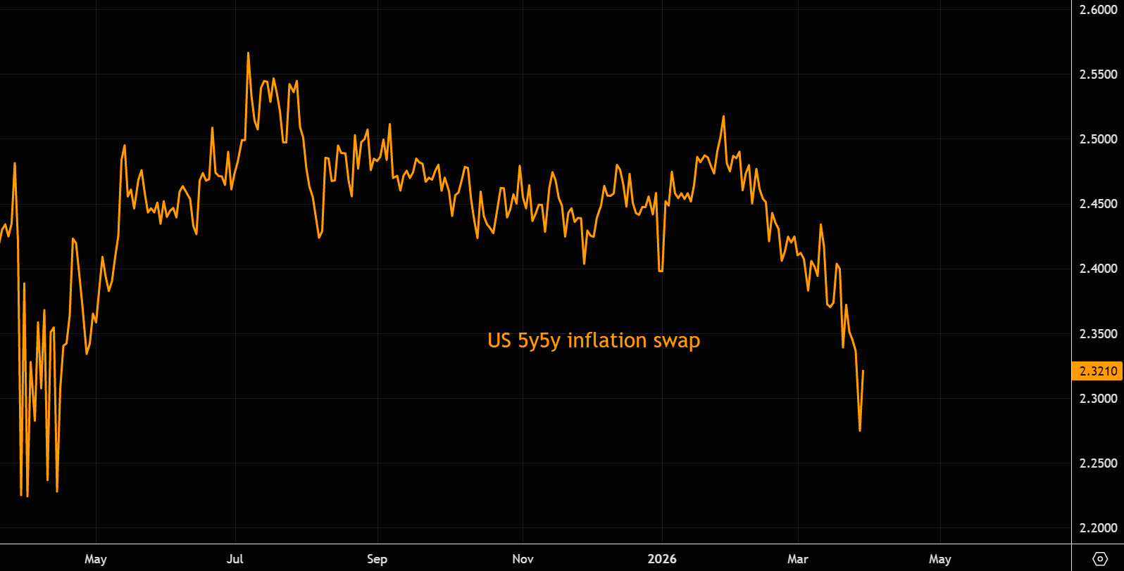 No bueno | “The collapse in forward inflation like 5y5y is telling you something…energy shocks generally not good for growth.” (GS Privorotsky) |  LSEG Workspace |