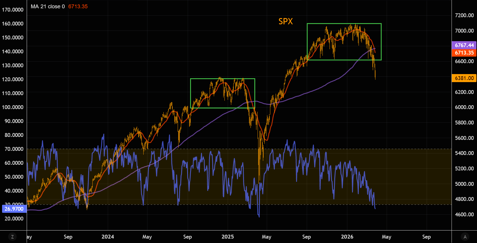 Base case stays intact | Our déjà vu framework that we’ve been outlining over the past weeks continues to play out almost perfectly. We’re now well below the 200-day, with the 21-day crossing below it, a “light” death cross. RSI is at its most oversold levels since the Liberation Day panic, so a bounce is possible. But catching falling knives isn’t a strategy we like. |  LSEG Workspace |