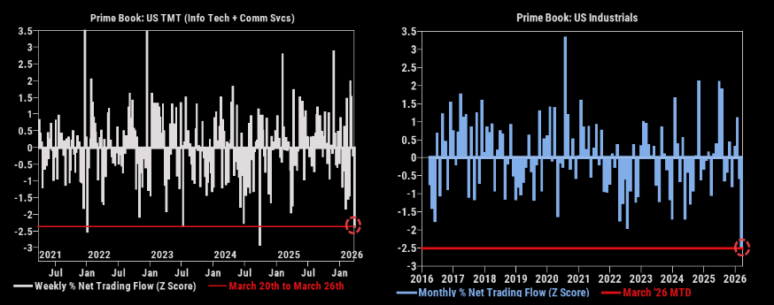Selling superlatives | Selling has broadened. TMT has seen one of its largest net selling weeks in years, with Mag7 names sold in 12 of the past 13 sessions. Industrials have now been net sold for five straight weeks, with March tracking as the largest percentage net selling on record, writes GS. |  GS |