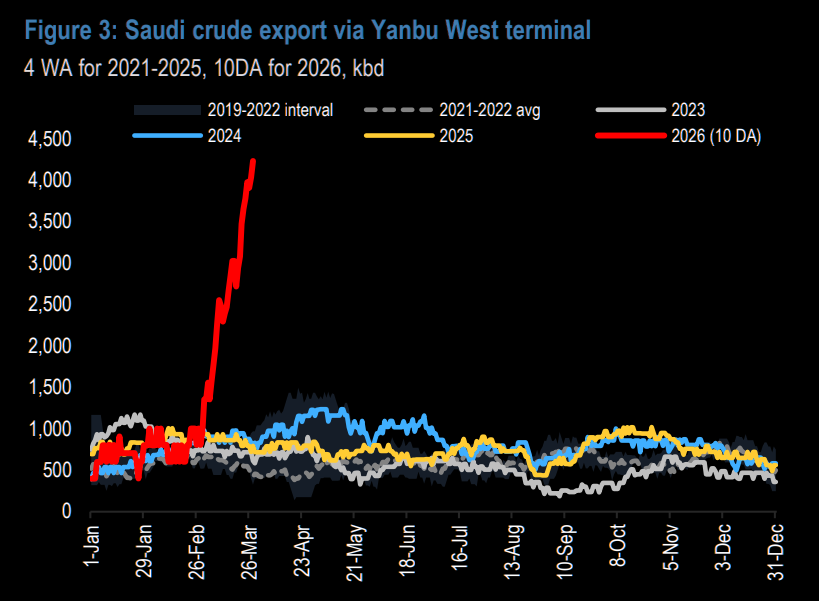 | Macro risks aren’t helping either. The Houthis’ involvement adds a second maritime pressure point in the Red Sea, with the ability to threaten Saudi Arabia’s Yanbu export hub and disrupt traffic through the Bab al-Mandeb. This puts ~5 mbd of Saudi bypass capacity at risk, potentially adding around $20/bbl to oil prices, writes JPM’s Kaneva. Workarounds exist, but longer routes could extend Asia shipping times by up to 40 days and require 130+ additional tanker voyages. Latest note on oil here. |  JPM |