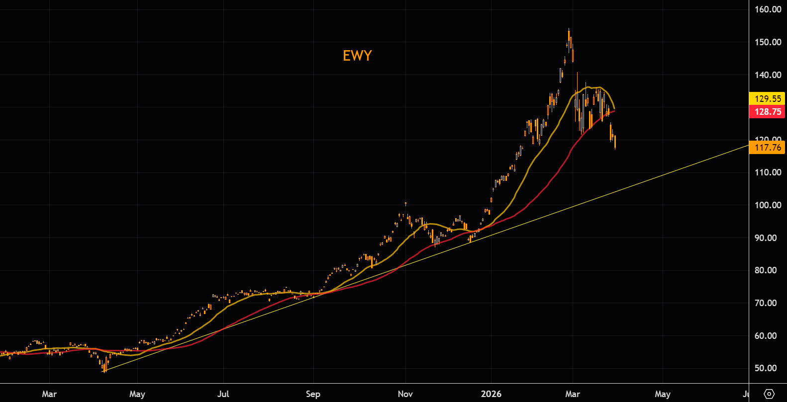 EWY suckers | On Feb 27, we flagged the Korean bull as stretched, noting: “EWY weekly RSI at 90 — that’s not early, that’s crowded.”Since then, EWY is down over 20%, breaking down and printing new lows. The 21-day is about to cross below the 50-day, while the longer-term trend sits well below. |  LSEG Workspace |