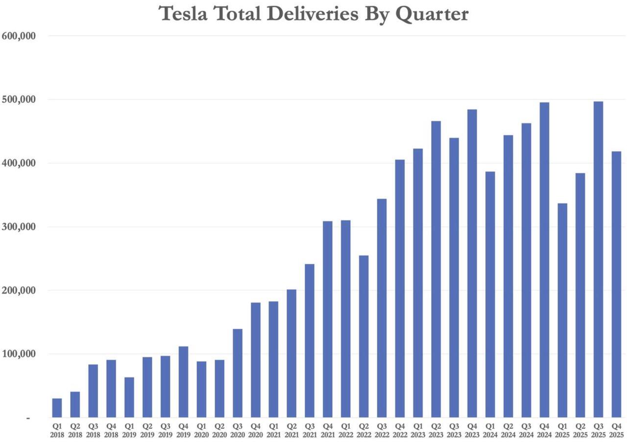 Tesla leverede 418.227 køretøjer i 4. kvartal 2025, hvilket er under Wall Streets forventning på cirka 426.000 leverancer, ifølge CNBC og virksomheden . Produktionen var på i alt 434.358 køretøjer. For hele året leverede Tesla 1,64 millioner køretøjer i 2025, hvilket er et fald på 9 % i forhold til 2024 og det andet årlige fald i leverancer i træk.