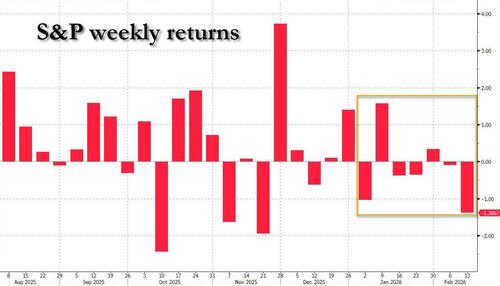 Last week, the S&P fell 1.4%, its worst week since late November. It has been ugly since the start of the year: YTD, the SPX has seen positive weekly returns in only 2 of the 7 weeks and is now negative on the year.
