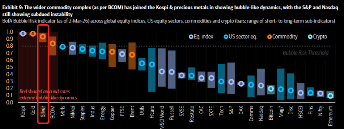 Silver remains the number 3 bubble according to BofA’s bubble risk indicator. For now, silver remains a market digesting excess rather than building a new trend.