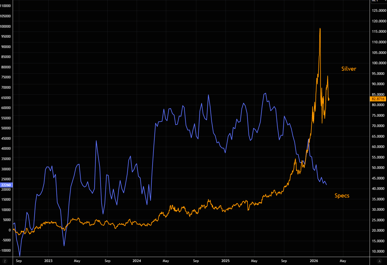Positioneringsdata viser, at nettopositionerne blandt ikke-kommercielle aktører – typisk hedgefonde og spekulative investorer – fortsat ligger relativt lavt. Disse investorer står i vid udstrækning på sidelinjen, uanset de seneste prisbevægelser i sølv.