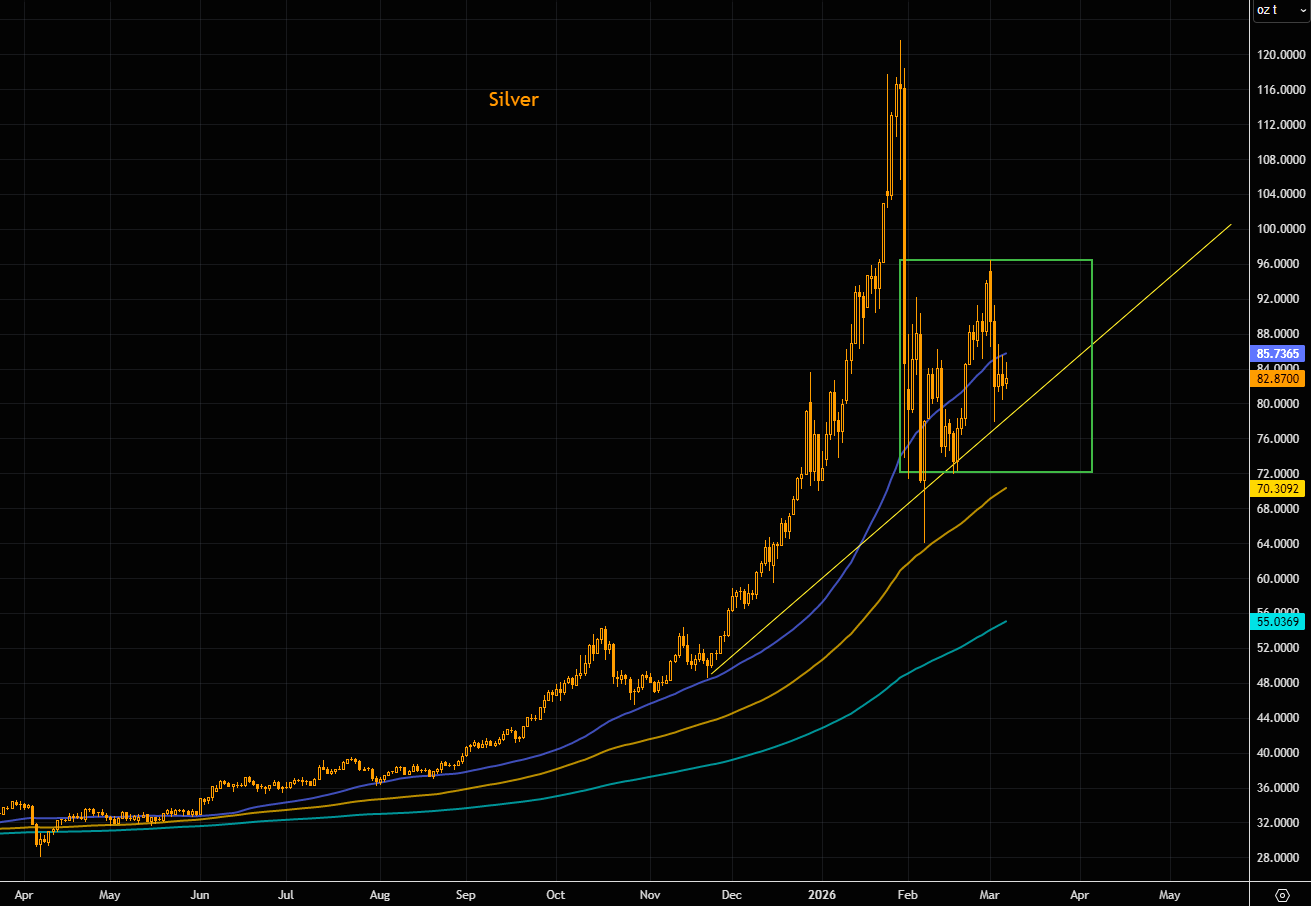 Our silver consolidation logic after the great “puke” remains intact. The metal likely needs more time to digest the extreme moves seen over the past few months. Major support sits around $72, while strong resistance comes in at $92–96, everything in between is largely noise. Silver is currently trading below the 50-day moving average but remains well above the 100-day (~$70) and the 200-day (~$55). Note the short-term trend line coming in around the $80 area.