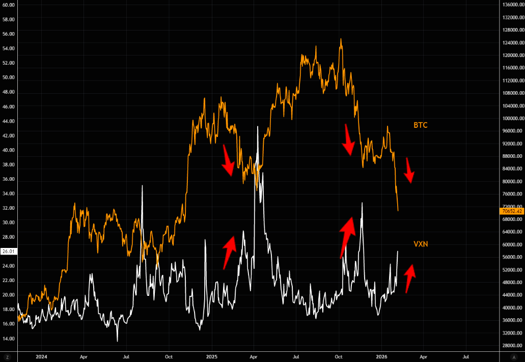 BTC afspejler den underliggende nervøsitet i markedet. Teknologi volatiliteten (VXN) er steget, og BTC gjorde præcis, hvad den skulle.