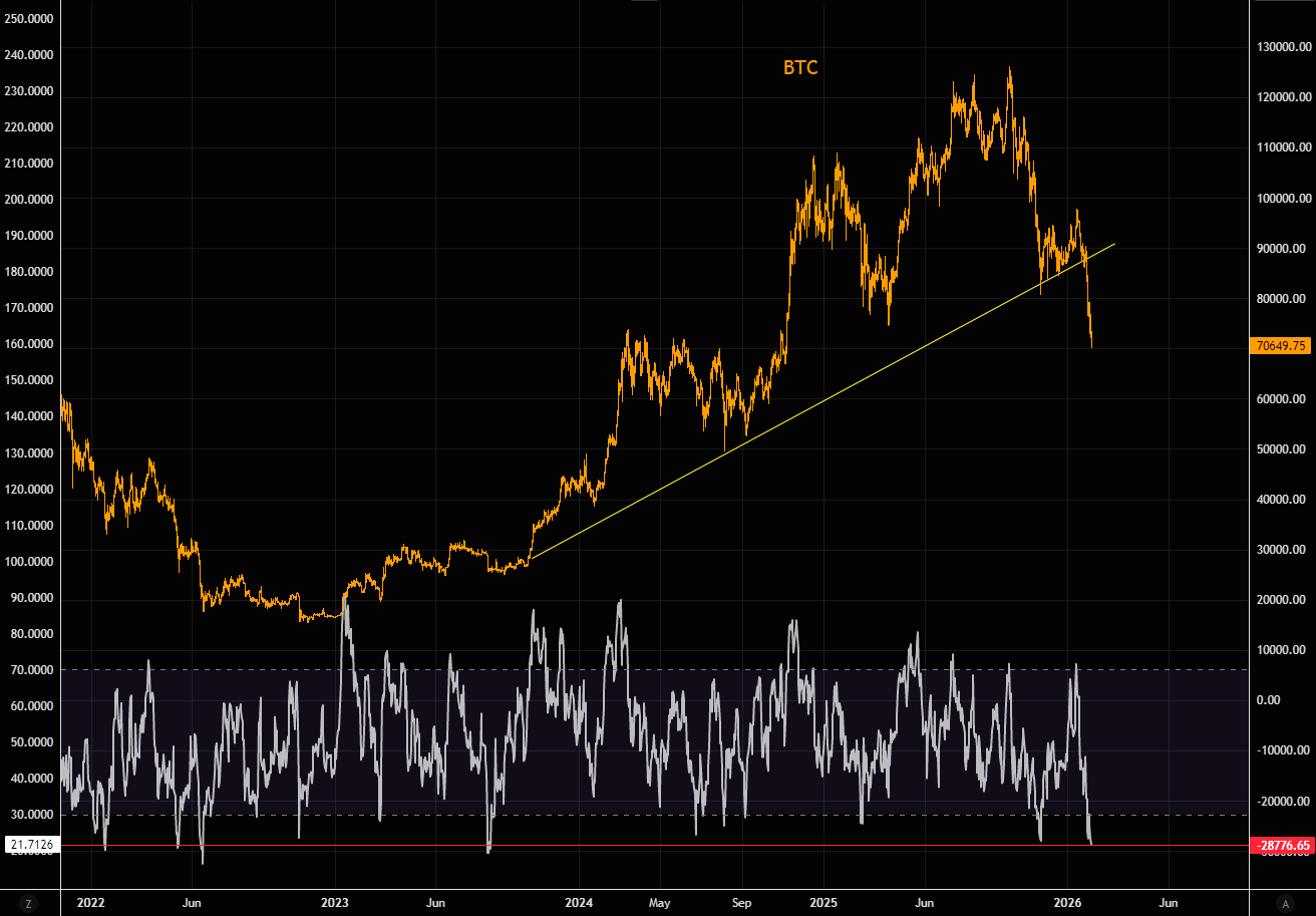 BTC har ikke været så oversolgt siden august 2023. Momentum er grim, og fristelsen til at fange et par faldende knive sniger sig ind.