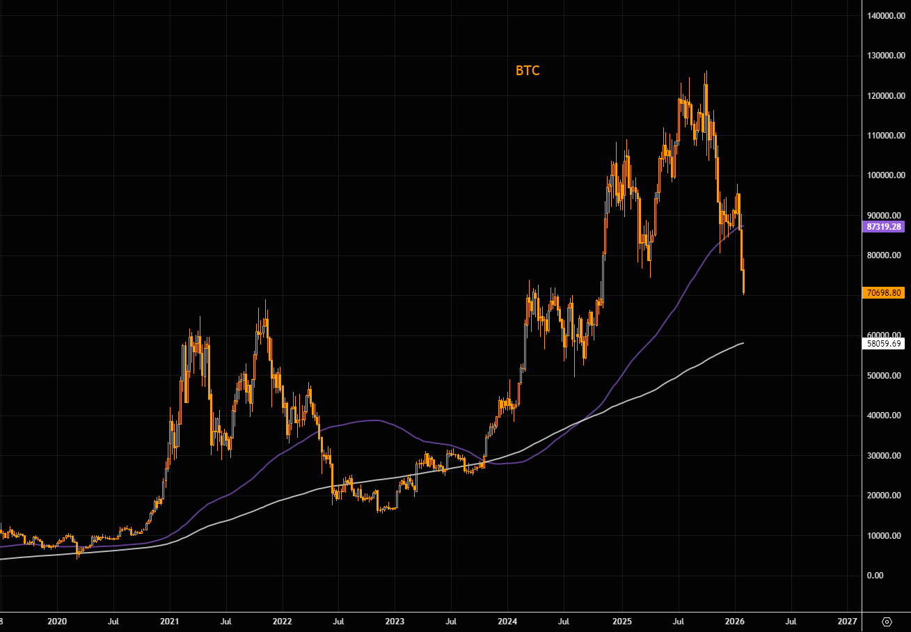 BTC brød den ugentlige 100 MA, da støtten omkring $90k faldt. 200 ugentligt gennemsnit falder omkring $60k-området.