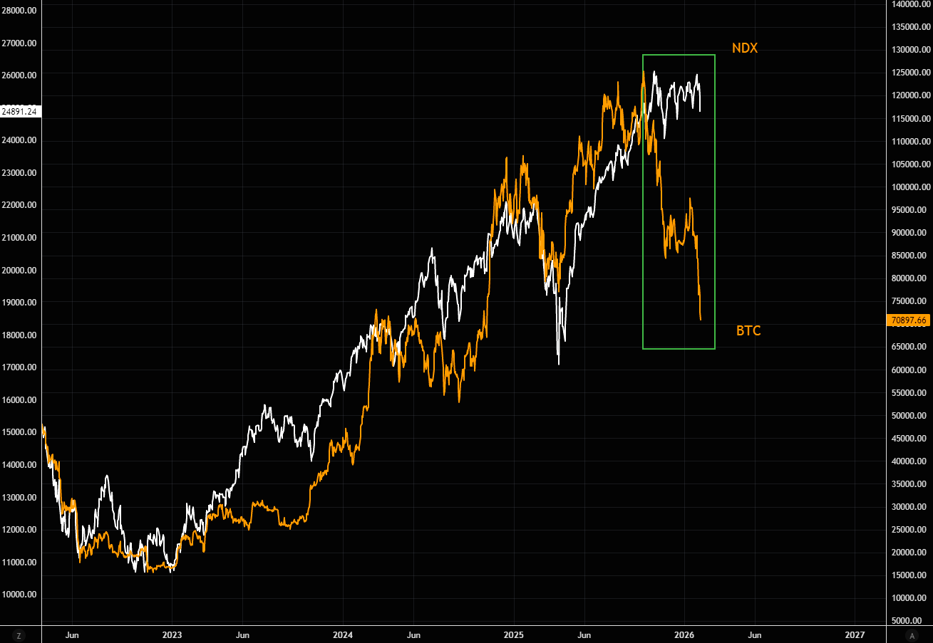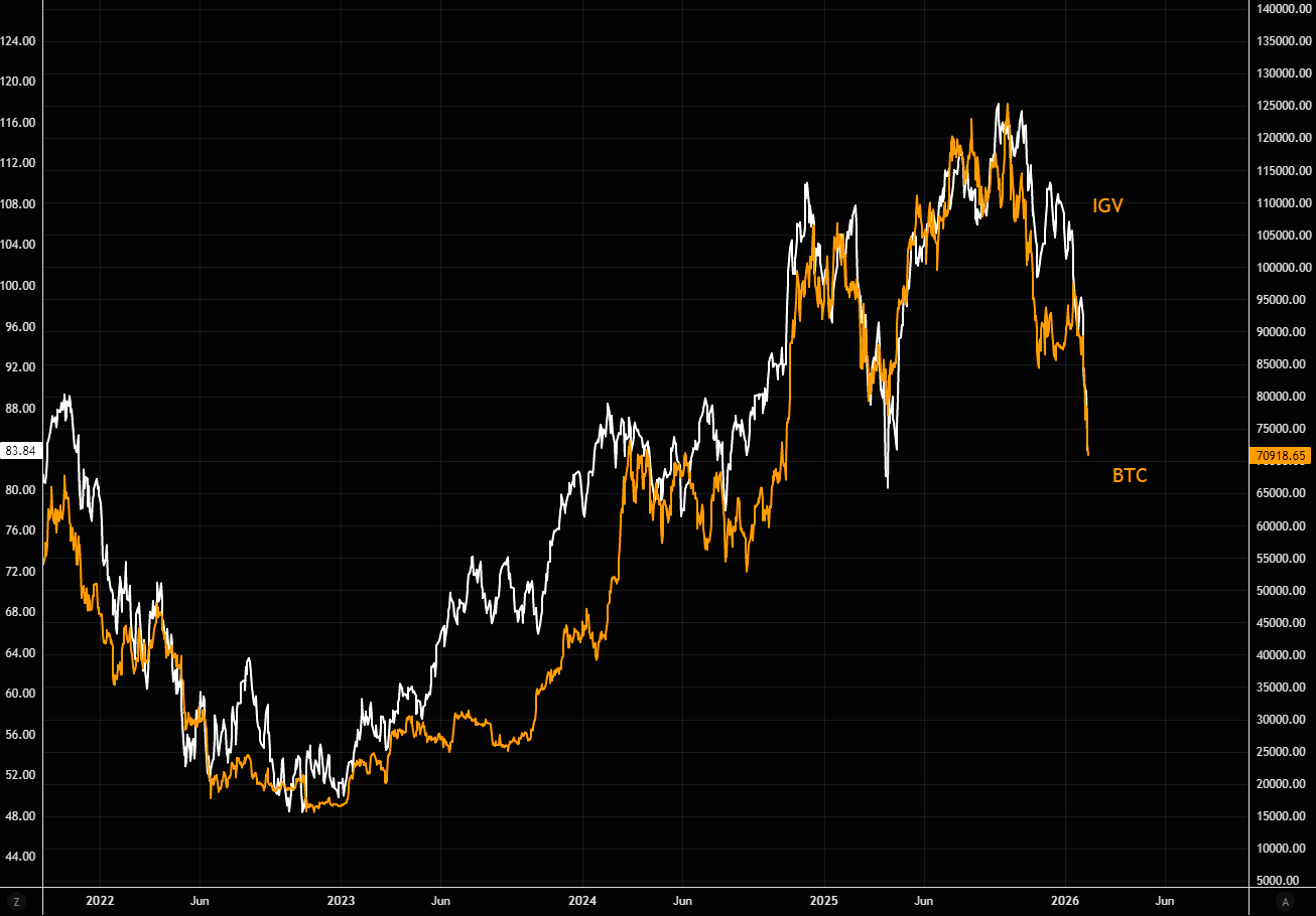 Kald det penge, kald det kode, kald det en filosofi … BTC handles stadig som software. Og i takt med at software er faldet i unåde, har BTC bevæget sig i perfekt tandem.