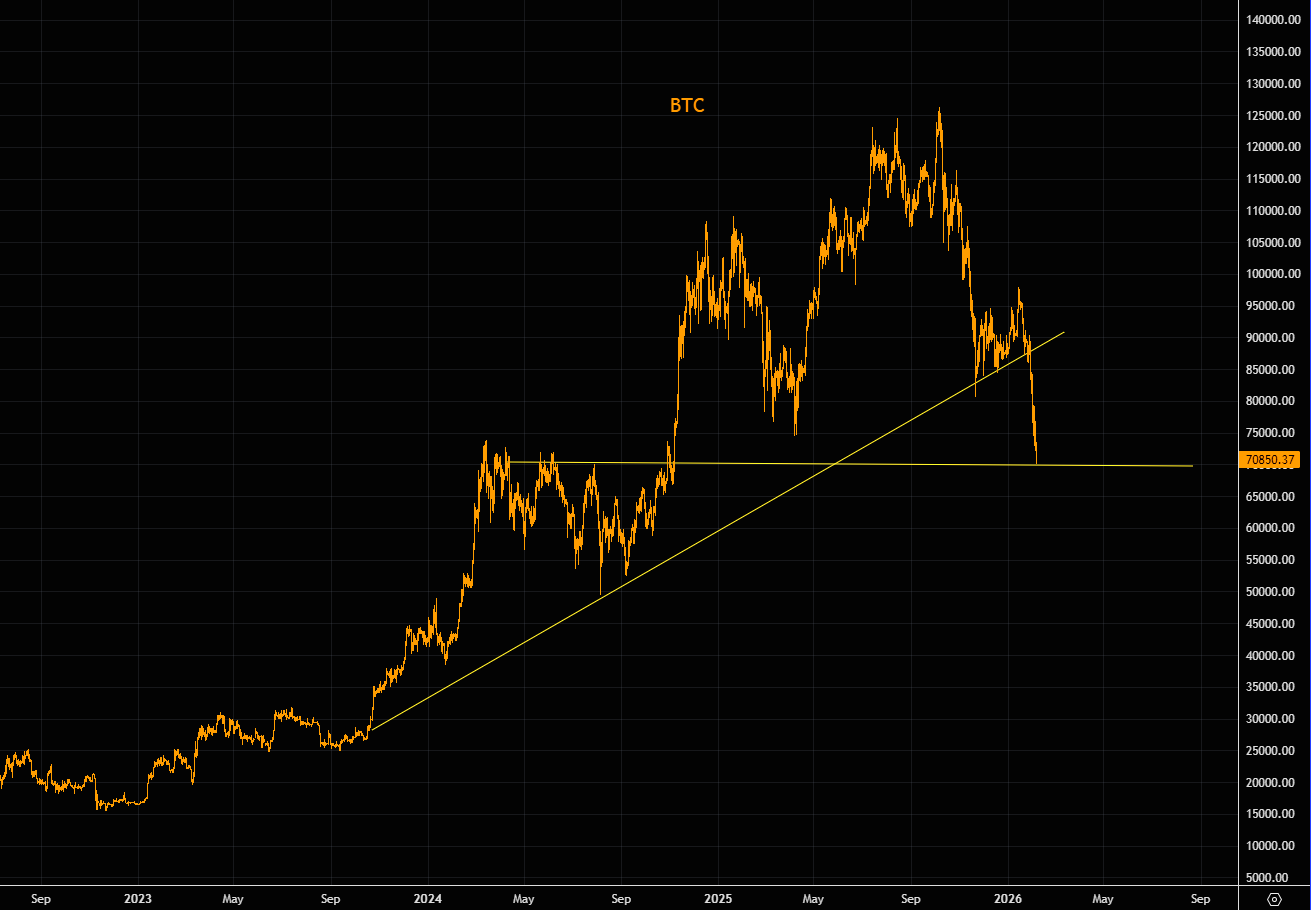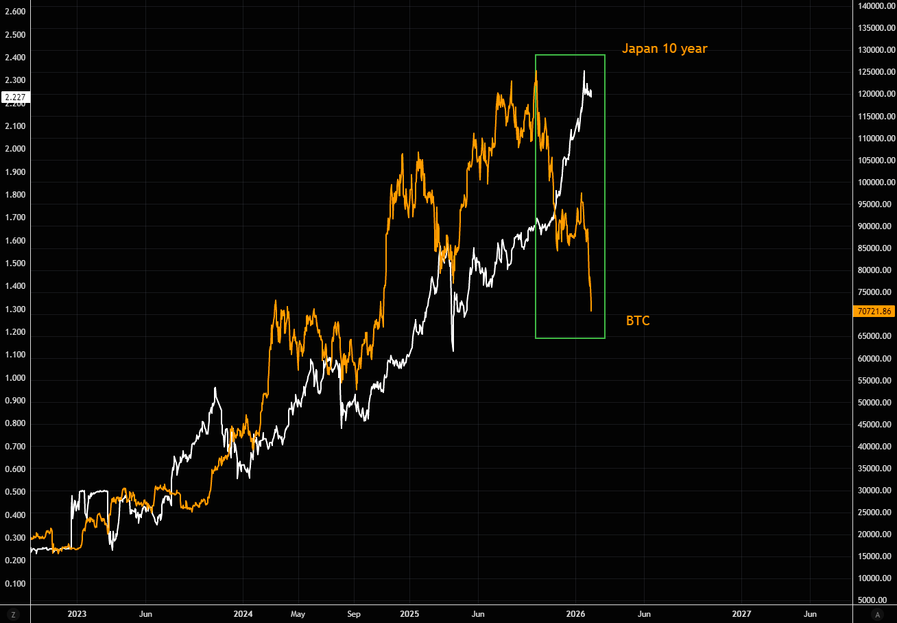 Du kan selv afgøre, om BTC er den ultimative hedge. Markedet har allerede besluttet noget andet: det seneste skub i den japanske long-end markerede BTC’s top. Siden da har det været ensrettet trafik.