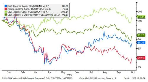 On the other hand, Low-Income Consumer Discretionary (GSXULOWD) is our favorite short theme at the moment…