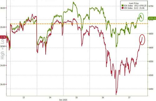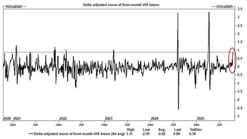 Equity vol and skew experienced a persistent, aggressive bid this week with SPX Nov fixed strike vols increasing by +3v (vs Monday’s close). On average this week leading up to Friday, the front month VIX future outperformed its beta to SPX by nearly a vol. Thursday was the standout – the front month VIX future outperformed its beta to SPX by 2.4v despite SPX closing down less than 1% – this has only occurred 4 other times in the last decade.