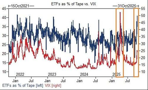 ETF volumes have exceeded 30% of the tape for 6 straight sessions, a streak which last occurred in April.