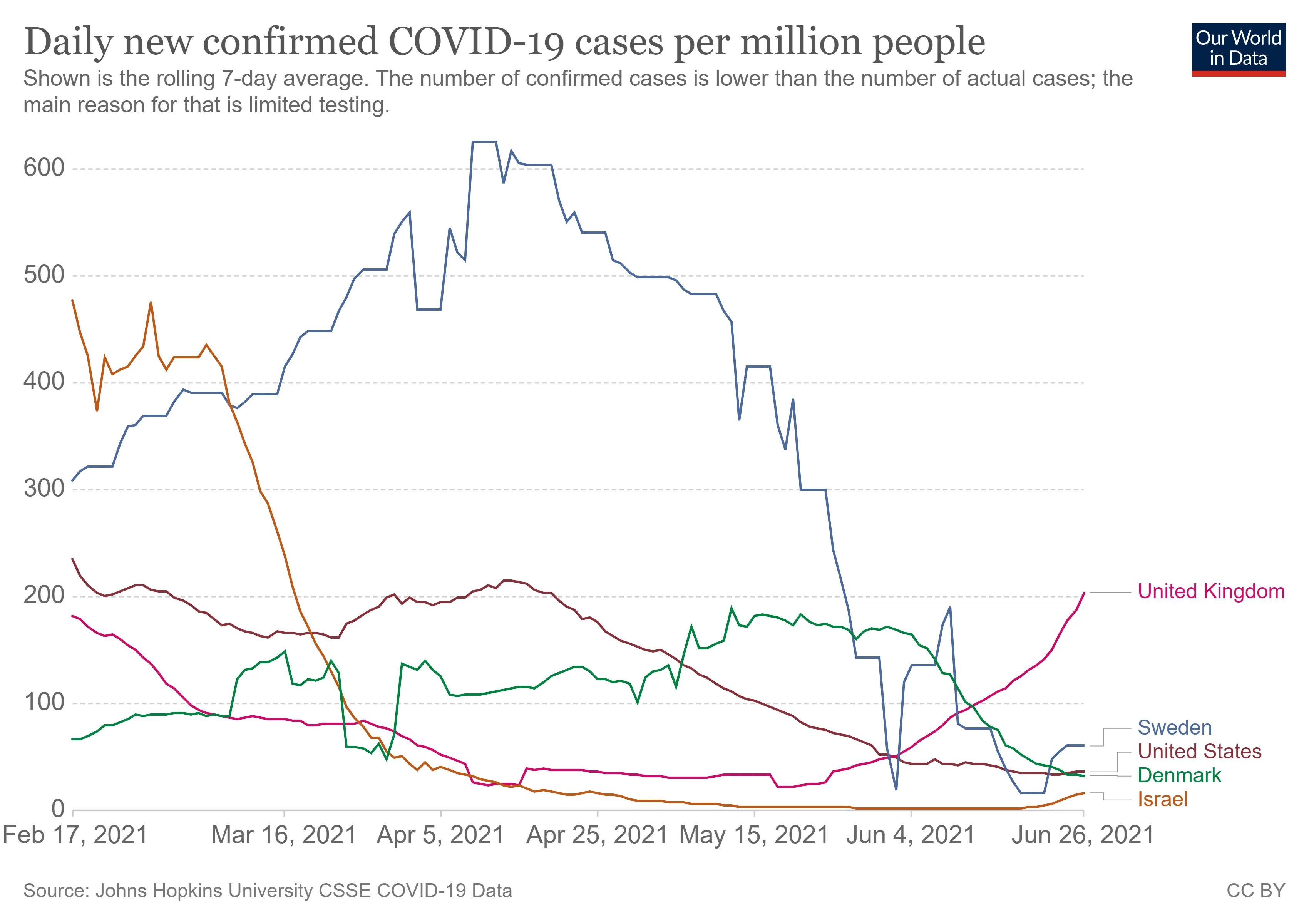 Grafik: Smittespredningen stiger nu kraftigt i UK, men også i andre lande begynder kurven nu at tippe opad.