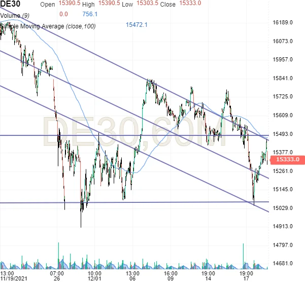 Kursgraf: Den tyske DAX Future skal som minimum overvinde 15.500, før vi kan håbe på en vending i den mellemsigtede nedtrend.