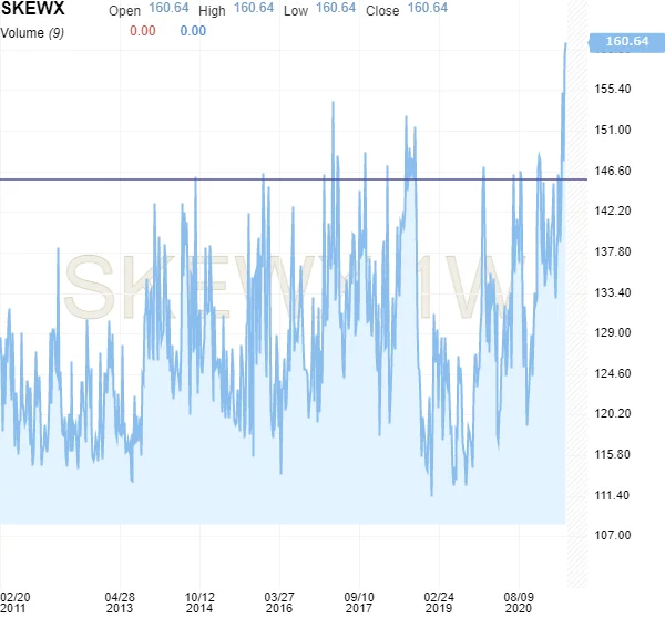 Vi konstaterer, at skew indeks de seneste dage er steget til en værdi på 160, som er et historisk højdepunkt.