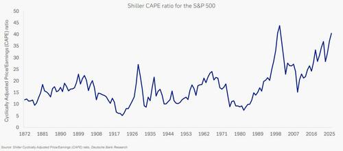 The Shiller Cyclically Adjusted Price/Earnings ratio is has passed 40, not too far below its peak of almost 44 in 2000