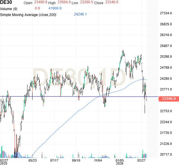 Kursgraf: Den tyske DAX Aktiefuture er under 200 dages glidende gennemsnit – og tester nu er afgørende støttelinje tilbage fra starten af sidste år