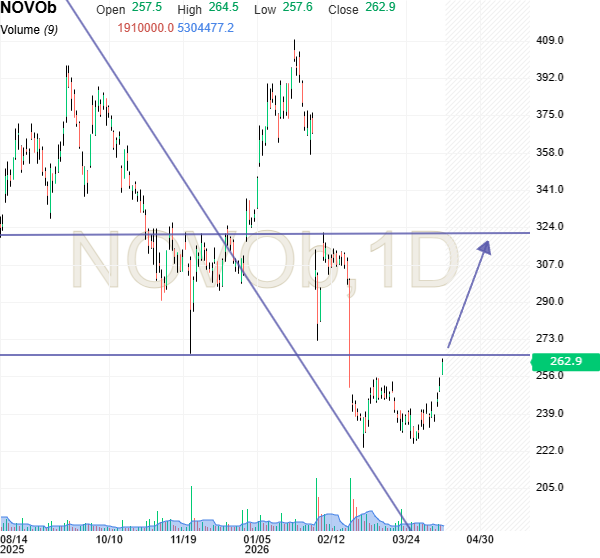 Kursgraf: Efter dagens stigning på fem procent i Novo aktien, er vi i Den Forsigtige Portefølje i stort set nul. Vi har en vægt på 15% af formuen i aktien. Derfor fastsætter vi nu et kursmål i 320, ca. 20 procent oppe, hvor vi begynder at reducere vægten fra 15% – til et langsigtet mål på 5%. Aktien handles fortsat til ca. tolv gange dette års overskud, hvilket er billigt for en kvalitetsaktie.
